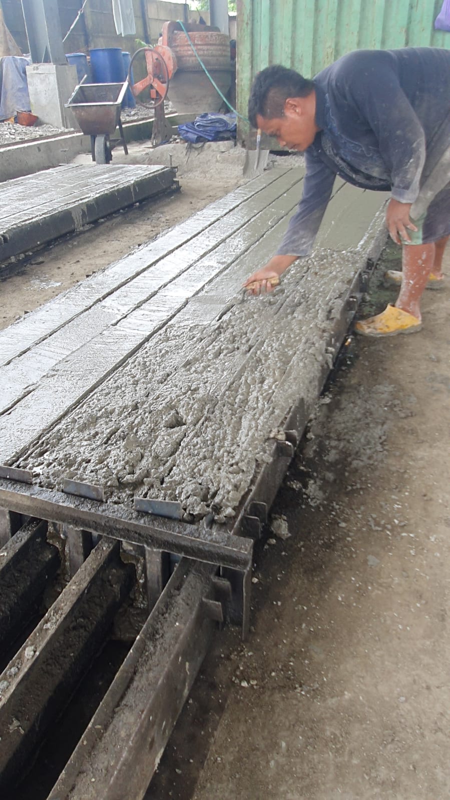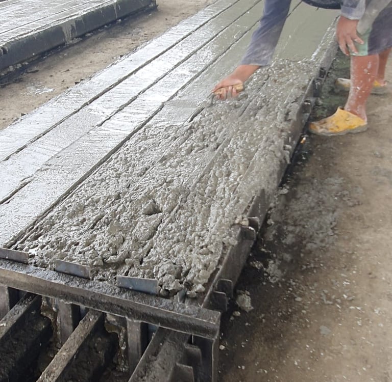 Pencampuran beton dilakukan dengan menggunakan mesin pencampur beton (concrete mixer). Komposisi yang tepat antara semen, pasir, kerikil, dan air sangat penting untuk memastikan kekuatan beton yang optimal. Beton harus dicampur dengan konsistensi yang tepat, sehingga mudah dicetak namun tetap memiliki kekuatan yang tinggi setelah mengeras.